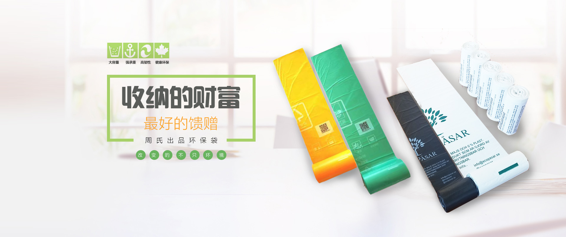公司主要研發生產全生物降解包裝袋、單一材質復合包裝袋、PLA/PBAT生物降解包裝袋、抑菌除臭袋、商超購物袋、服裝袋、PE平口袋、生物降解奶茶袋、食品用連卷袋、禮品袋、冷凍袋、菌菇培養袋、防靜電袋、屏蔽袋、方底袋、背心袋、異形袋、快遞袋、氣泡袋、防銹袋、抽繩垃圾袋、魚鱗卷抽繩袋、可追溯二維碼垃圾袋、城市分類一袋一碼垃圾袋、食品包裝袋、自立袋、三邊封袋、八邊封袋、真空包裝袋、鋁箔袋、高溫蒸煮袋、冷藏冷凍袋、寵物食品包裝袋、自動包裝卷膜等各種包裝袋。
